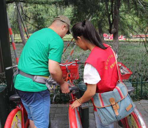 国庆长假进入第二天,杭州西湖边人流摩肩接踵,车辆拥堵严重,租用免费的公共自行车成了许多游客的最佳选择。景区的各个公共自行车服务点的工作人员比往日繁忙了不少,不断有游客前来租车、还车、问路。这个时候,自然少不了志愿者的身影。