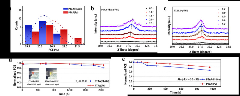 图2 (a) PEAI修饰后的电池效率统计图,不同溶剂处理PTAA薄膜后的PTAA/钙钛矿薄膜的GIXRD图,电池在氮气(d)及空气(e)条件下PCE的变化趋势图。