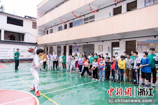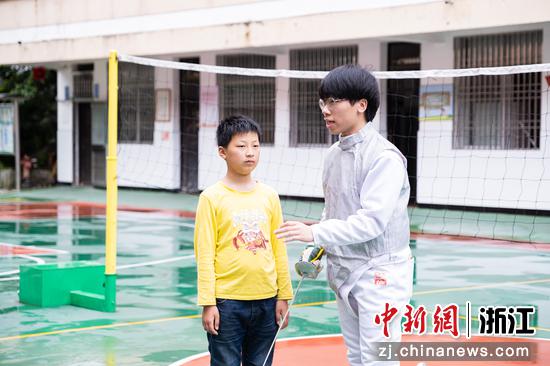 “不论是花剑、重剑,还是更加接近战斗状态的佩剑,都需要勤学苦练而且善动脑筋,才能成为高水平‘剑客’。”在仙居溪港乡中心学校的运动场上,杭电击剑队员王海杰边挥剑示范,边对带着殷殷期待眼神的中小学生们说。